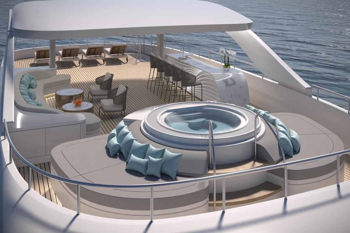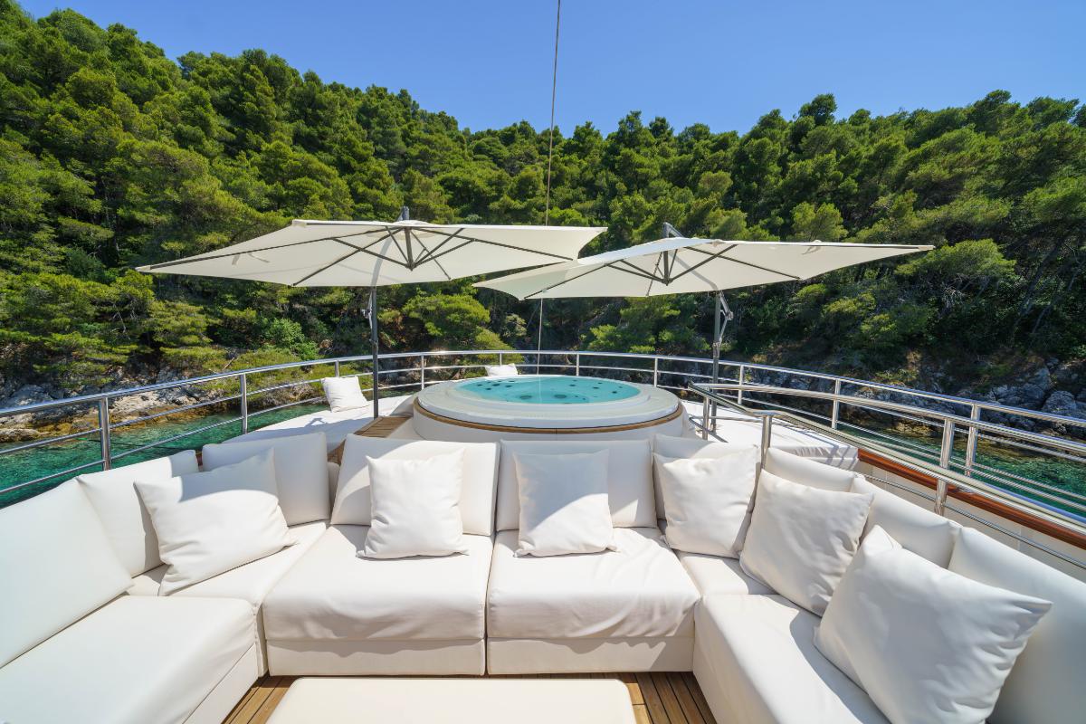Whether enjoying a quiet morning coffee, sunbathing under the Mediterranean sky, or gathering for sunset cocktails, the sun deck becomes the heart of life on board, a place where comfort, scenery, and effortless luxury come together.