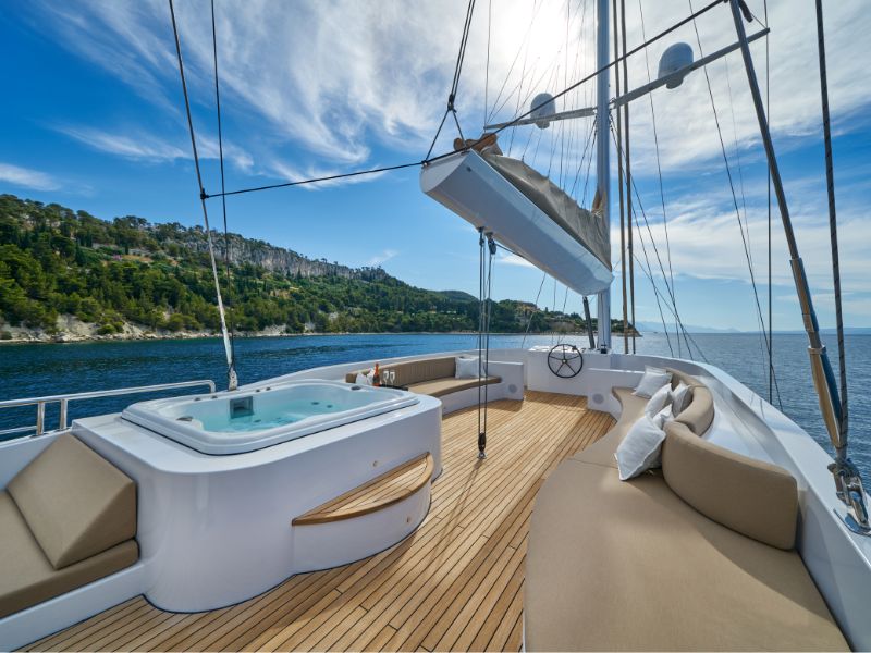 The yacht also features plenty of spaces to unwind, including a large aft deck with a dining area for open-air meals and a generous sundeck where you can soak up the sunshine, mingle, or simply take in the views. To truly unwind, slip into the jacuzzi and watch as the sun dips below the horizon.