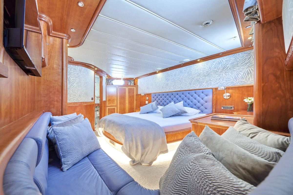 Step inside this unique Croatia gulet charter, and you’ll understand why she felt like the one. The salon is bathed in natural light, framed by honey-toned wood and a curved stained-glass ceiling that adds softness to every corner. It doesn’t shout luxury — it whispers it, gently. This is a space where you slow down without noticing, where mornings ease in with the scent of coffee and evenings stretch out in comfort.