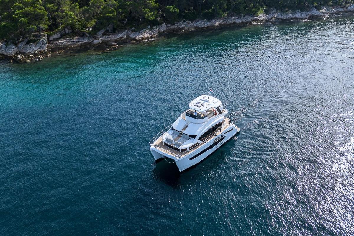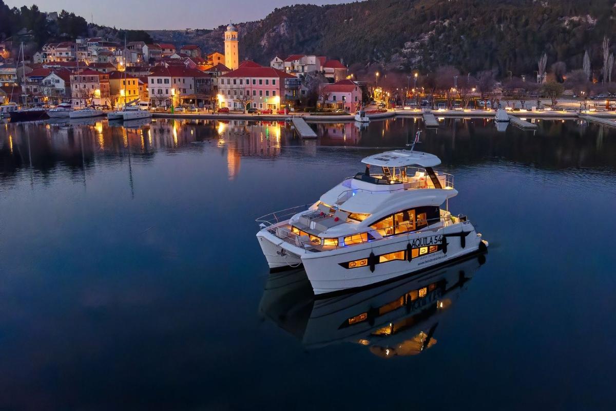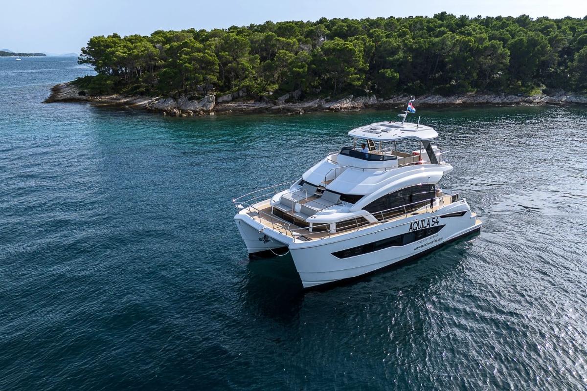 This brand-new 16.5m Aquila catamaran (2024) combines performance and luxury, cruising at 13 knots with a top speed of 22 knots. She accommodates 8 guests in four elegant double cabins, including a spacious master, and offers generous outdoor areas with a flybridge ideal for relaxing and entertaining. Fully equipped with premium water toys, chase boat, A/C, and Wi-Fi, she ensures a stylish and exciting Adriatic charter experience.