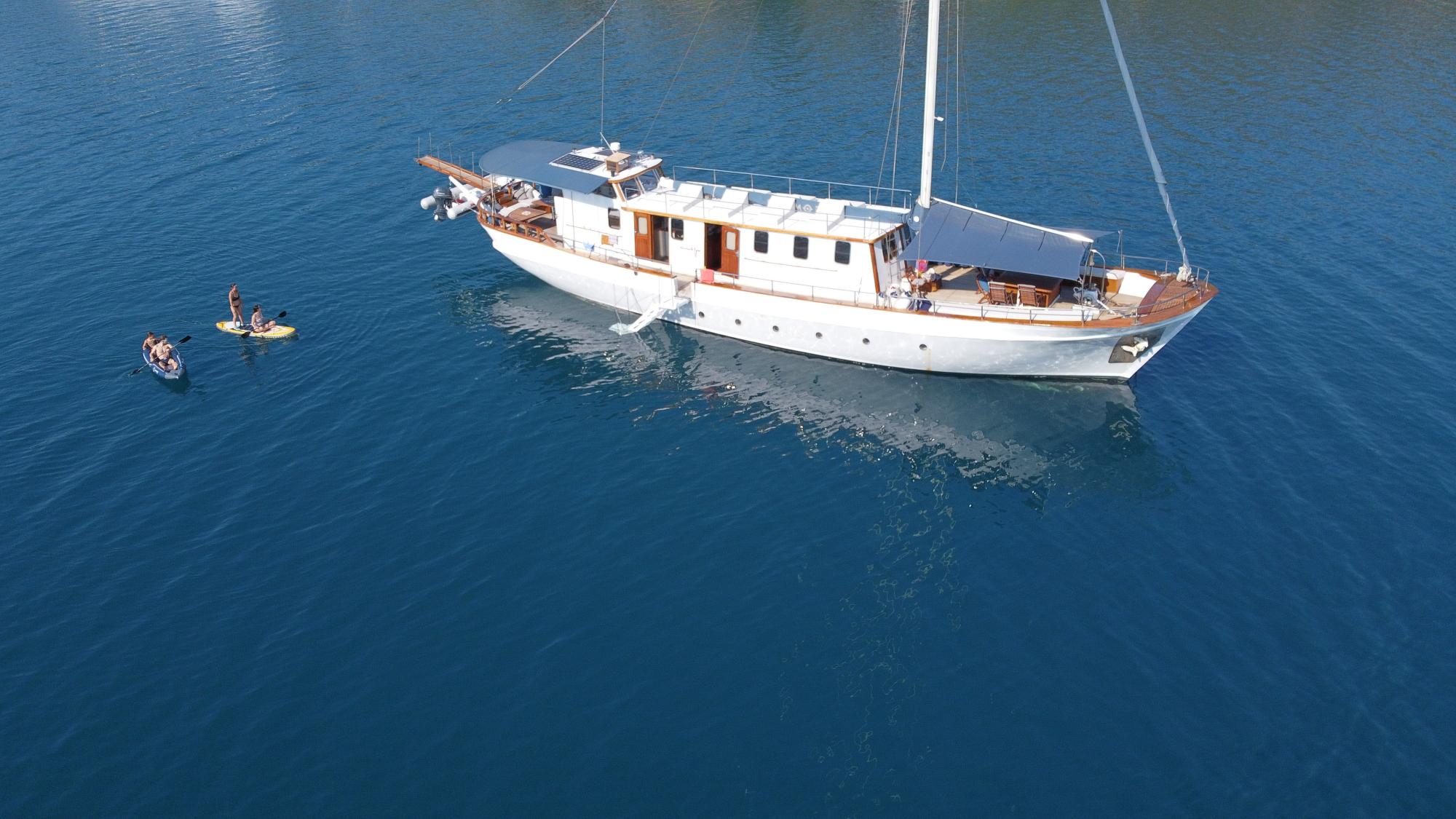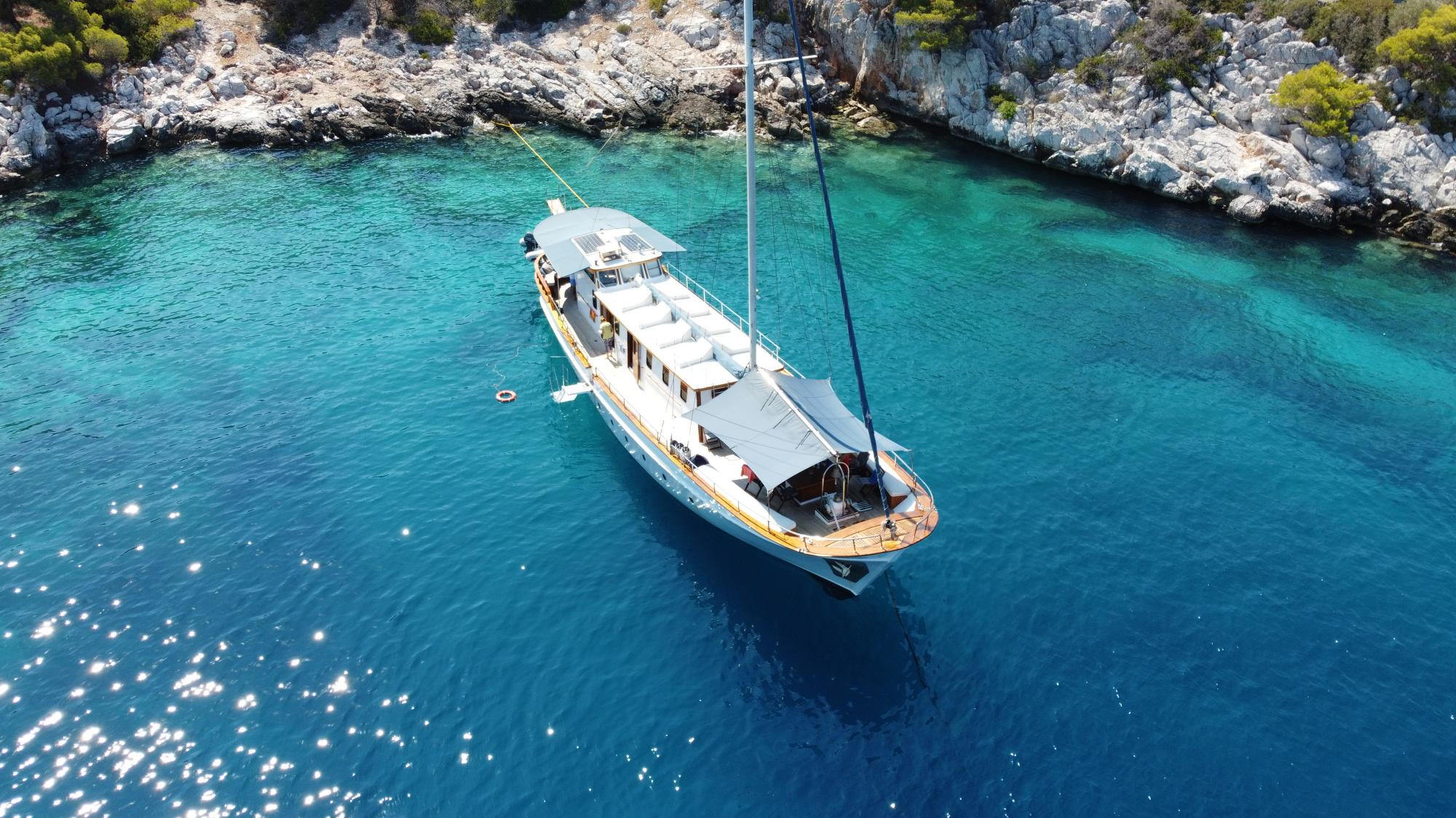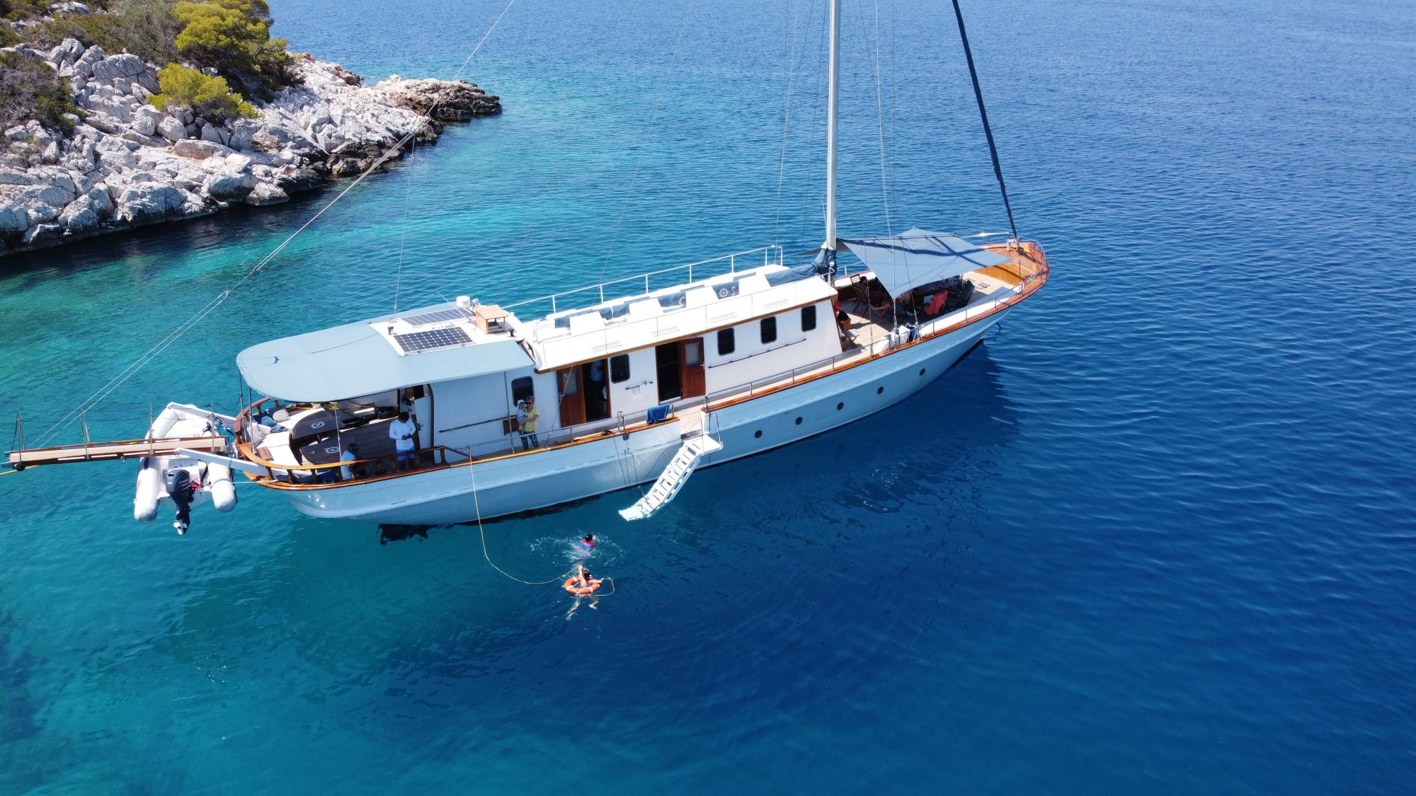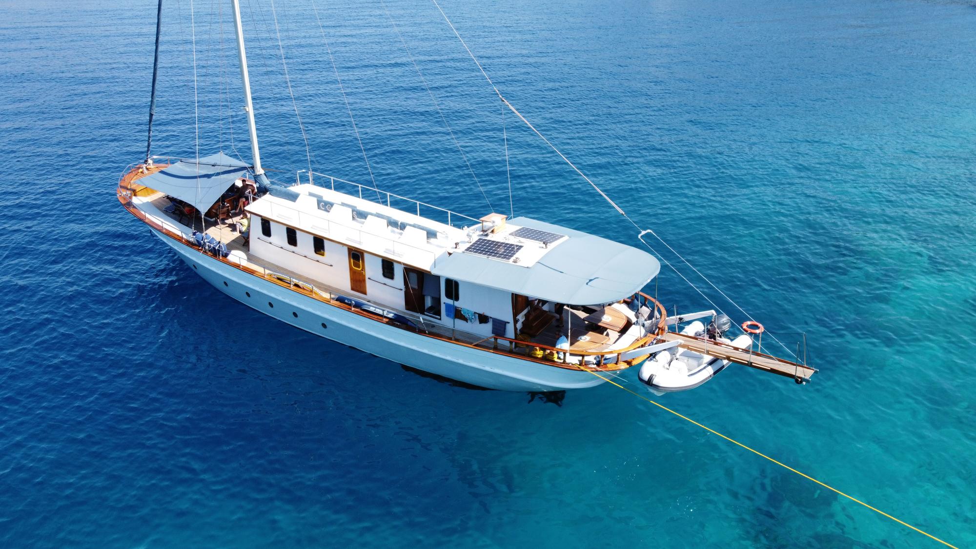 A masterpiece of traditional craftsmanship with a graceful elliptical stern, COSMOS combines classic wooden yacht charm with modern luxury. Designed to host up to 8 guests in four beautifully appointed cabins, she offers serenity, comfort, and understated opulence for unforgettable voyages.