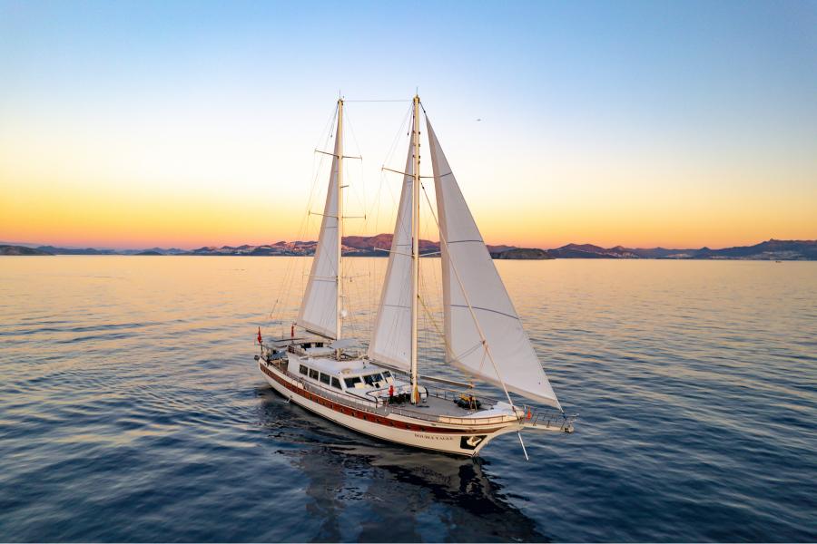 S/Y DOUBLE EAGLE is a 39.6m (130’) luxury sailing yacht, that blends traditional Turkish craftsmanship with modern comforts. Built in 2005 and refitted in 2023, she features a wooden hull and elegant interiors. Accommodating up to 12 guests in five ensuite cabins, including two master suites, she offers spacious lounging and dining areas across her aft deck, forward deck, and flybridge. Guests can enjoy alfresco dining, panoramic views, and ample sunbathing spaces. Awarded for her exceptional crew and culinary excellence, DOUBLE EAGLE ensures a premium charter experience with air conditioning, Wi-Fi, and a fantastic selection of water toys.