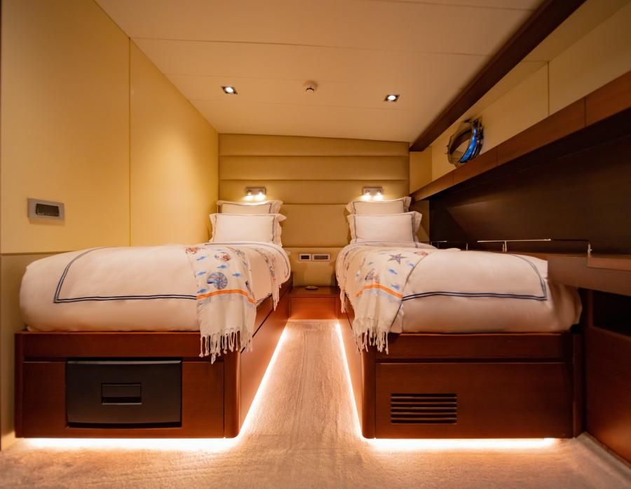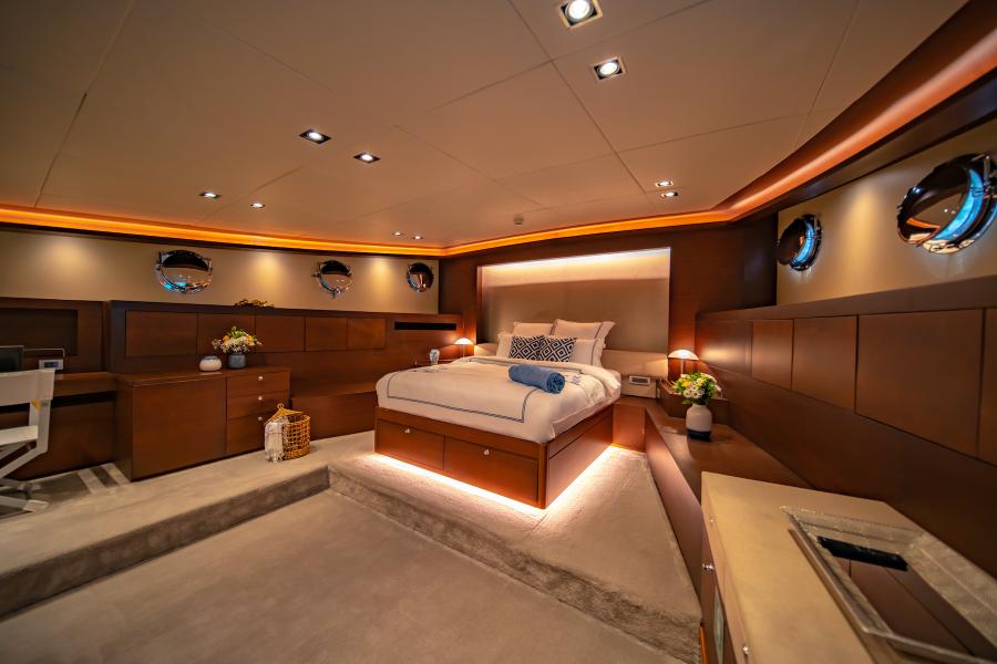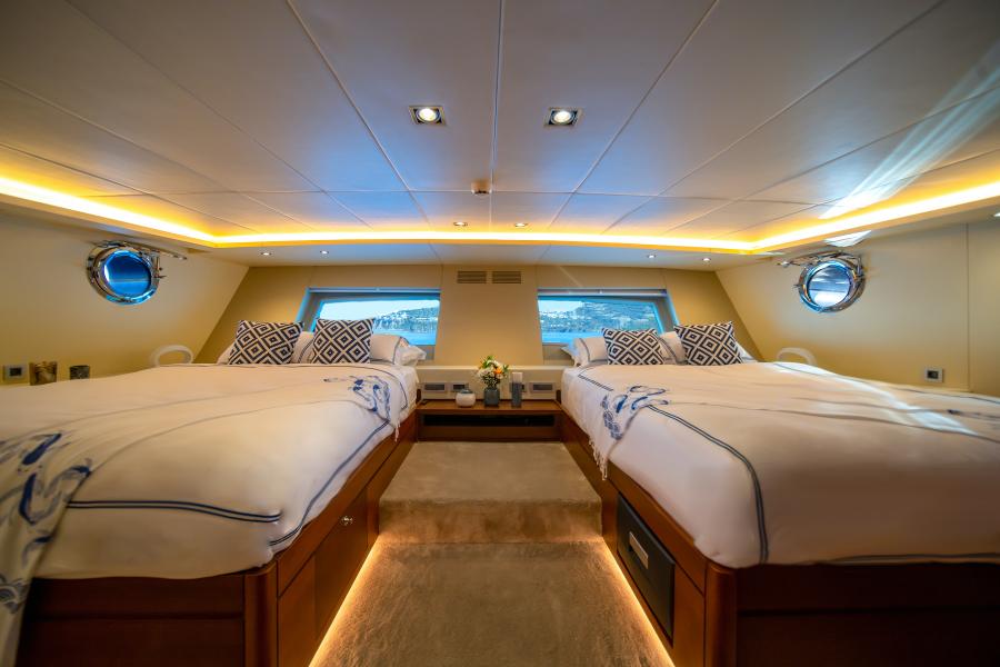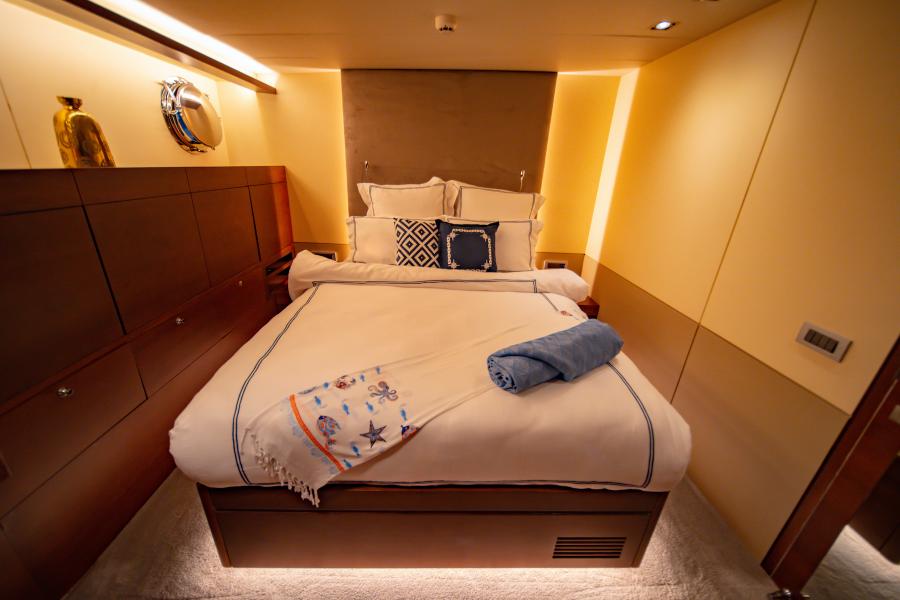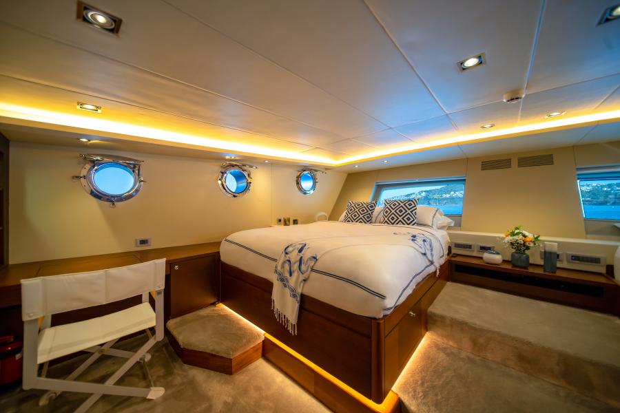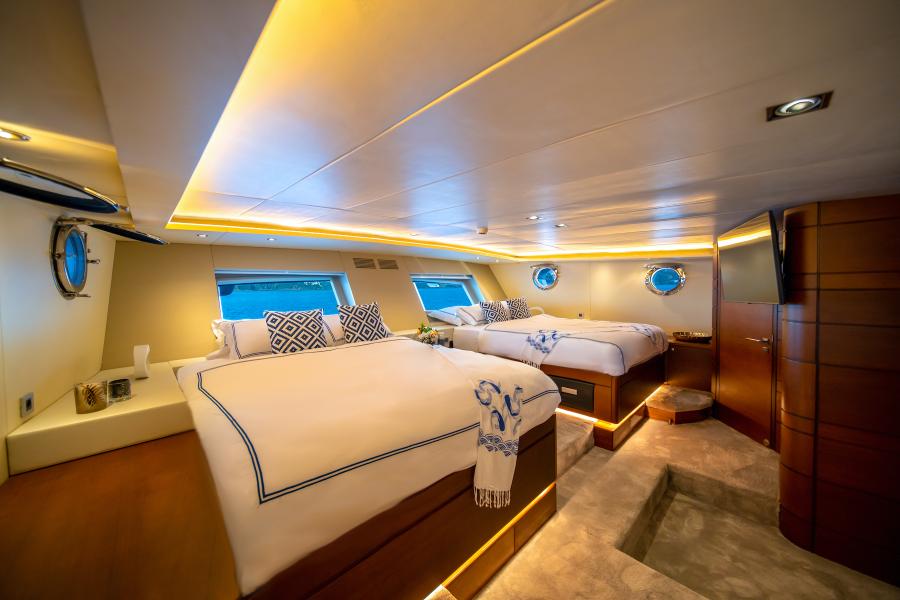 - Luxurious Accommodation: Five en-suite cabins, including two master suites with king-sized beds, vanities, and ample space, comfortably sleeping up to 12 guests.