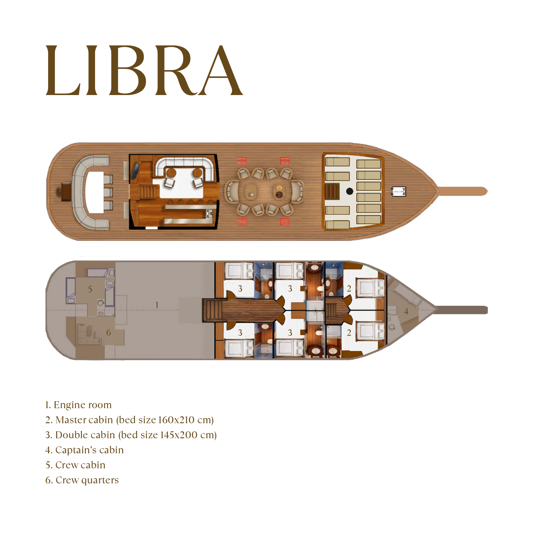 - Comfortable Cabins: Accommodating up to 12 guests in 6 air-conditioned, en-suite cabins, Libra ensures comfort with opening portholes for fresh air and natural light.