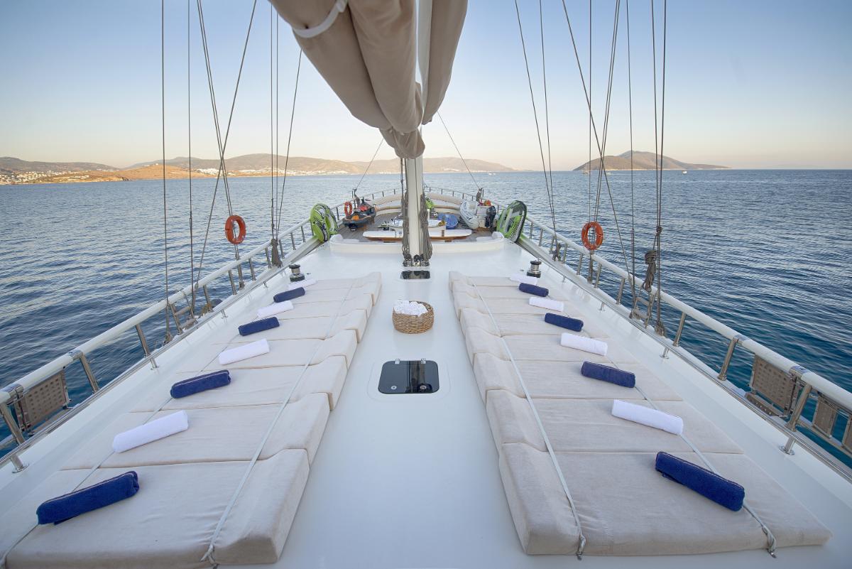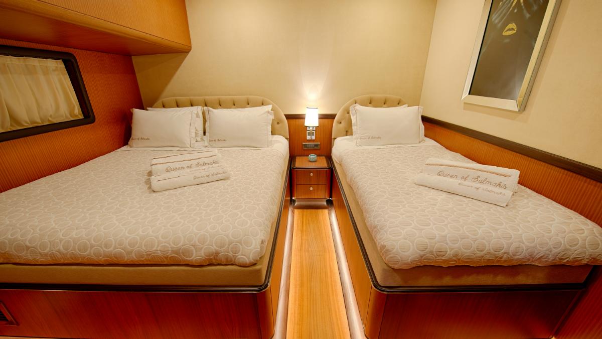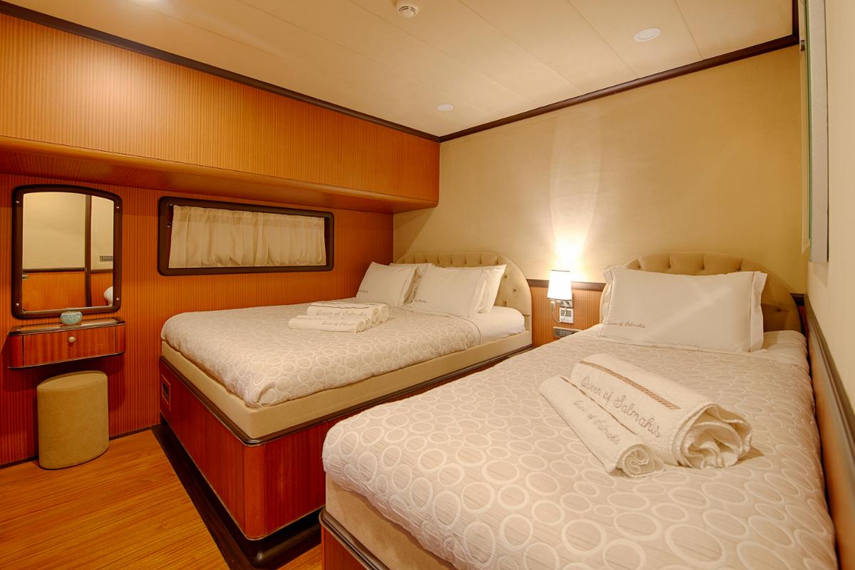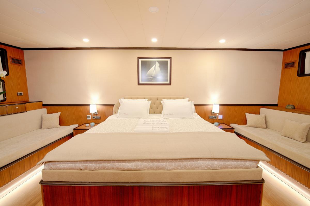 S/Y QUEEN OF SALMAKIS is a 39.1m (128.3ft) luxury sailing gulet, built in 2019, designed with modern owners and charter groups in mind. She offers an exceptional layout with spacious dining and sunbathing areas, perfect for large families or groups celebrating special occasions. The unique foredeck Jacuzzi and ample outdoor spaces enhance the comfort and luxury onboard. Accommodating up to 18 guests in 8 en-suite cabins, including two master suites, two triple cabins, and four double cabins, she also provides an expert crew of 7 to ensure top-notch service. The interior blends classic style with contemporary comforts, creating a timeless environment. Whether relaxing on the aft sun pads, enjoying casual meals on the forward deck, or unwinding in the Jacuzzi, guests are guaranteed a memorable experience.