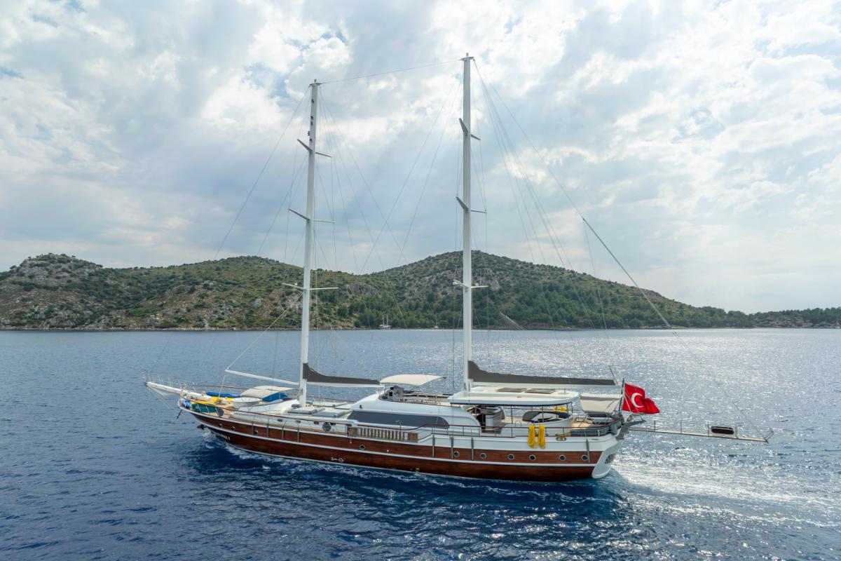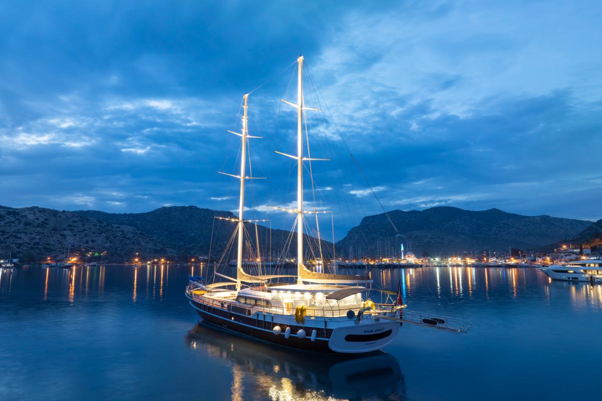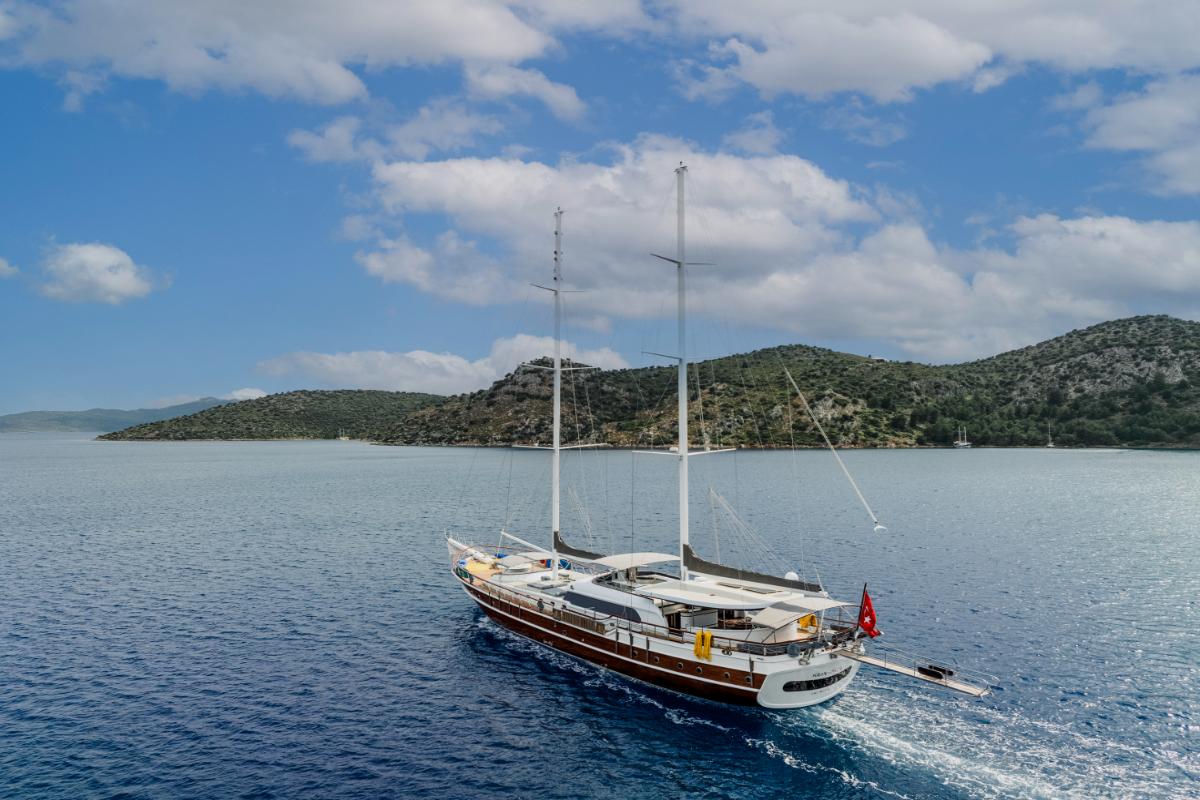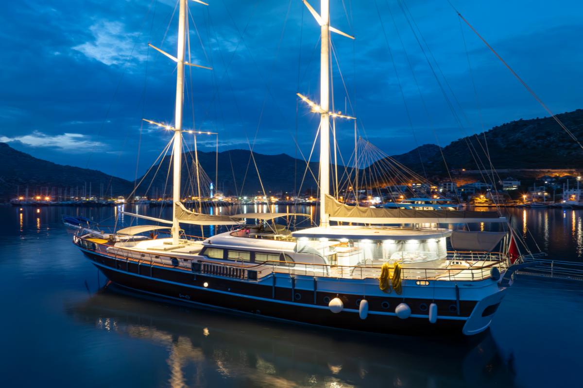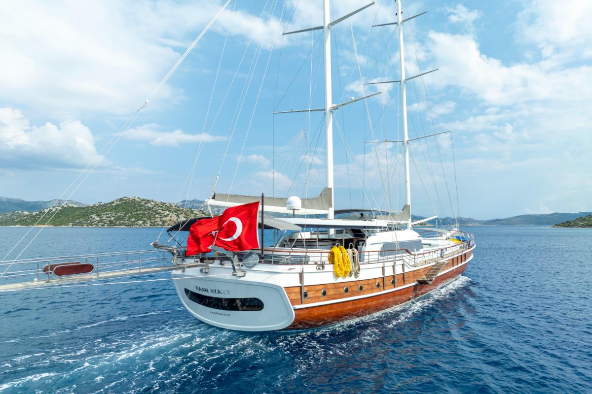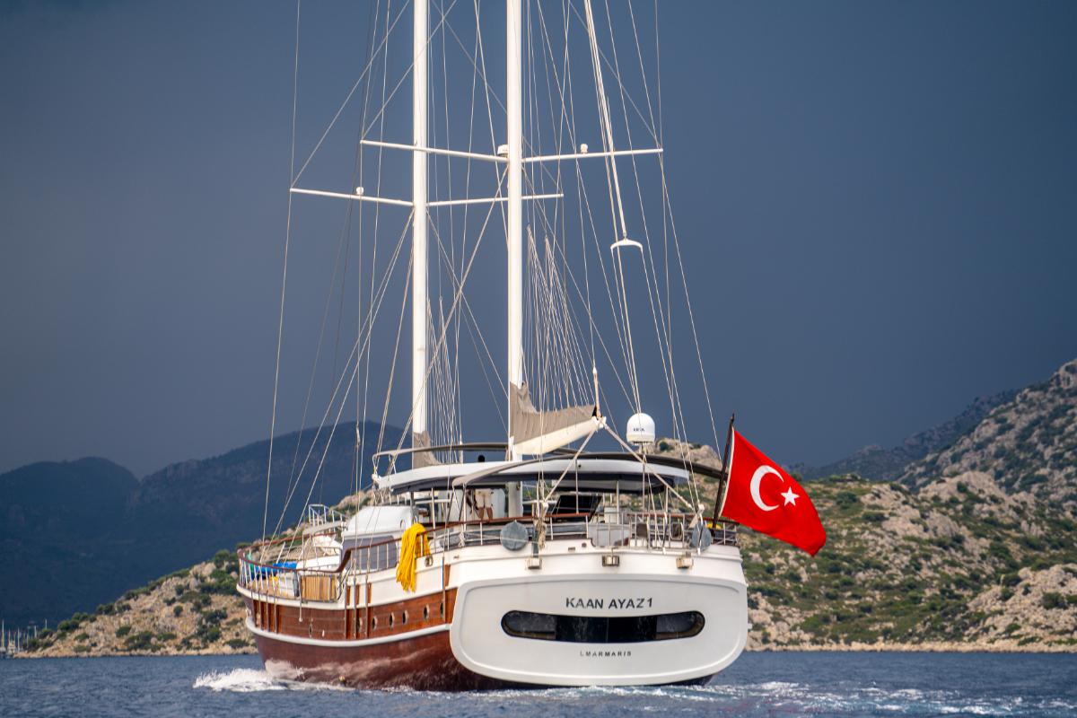 The 36-meter Kaan Ayaz is a newly built luxury motor sailer that beautifully combines sleek modern design with traditional Turkish craftsmanship. Based in Marmaris, this elegant yacht offers spacious indoor and outdoor living areas, perfect for relaxing, dining, or socializing while at sea. Equipped with advanced facilities and luxurious amenities, Kaan Ayaz ensures a seamless and comfortable charter experience. The yacht accommodates up to 12 guests in six beautifully appointed cabins, including two master cabins, two double cabins, and two twin cabins, each featuring en-suite bathrooms, air conditioning, premium linens, and ample storage. A separate crew area guarantees complete privacy for guests, while the professional crew provides attentive service, making every journey through the Turkish and Aegean Seas not just a cruise, but a truly unforgettable and relaxing escape.