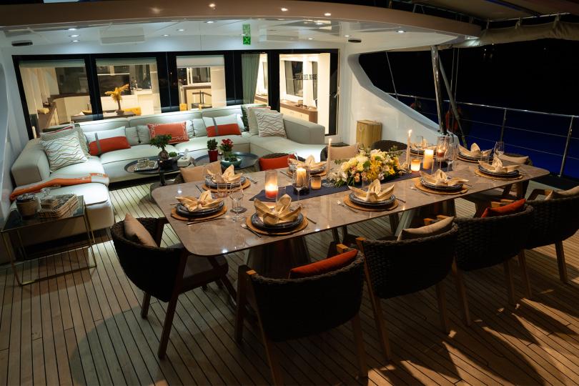 The aft deck is designed for alfresco living, featuring a comfortable seating area and a dining table, perfect for enjoying gourmet meals by the water. Meanwhile, the upper deck offers an additional jacuzzi, a relaxed seating area, and a dining table, creating the ultimate space for sunset cocktails and starlit dinners.