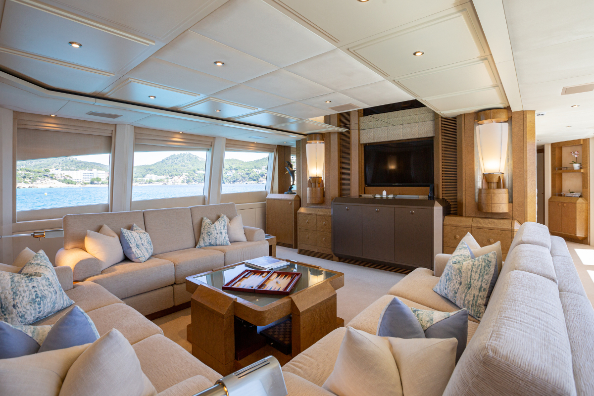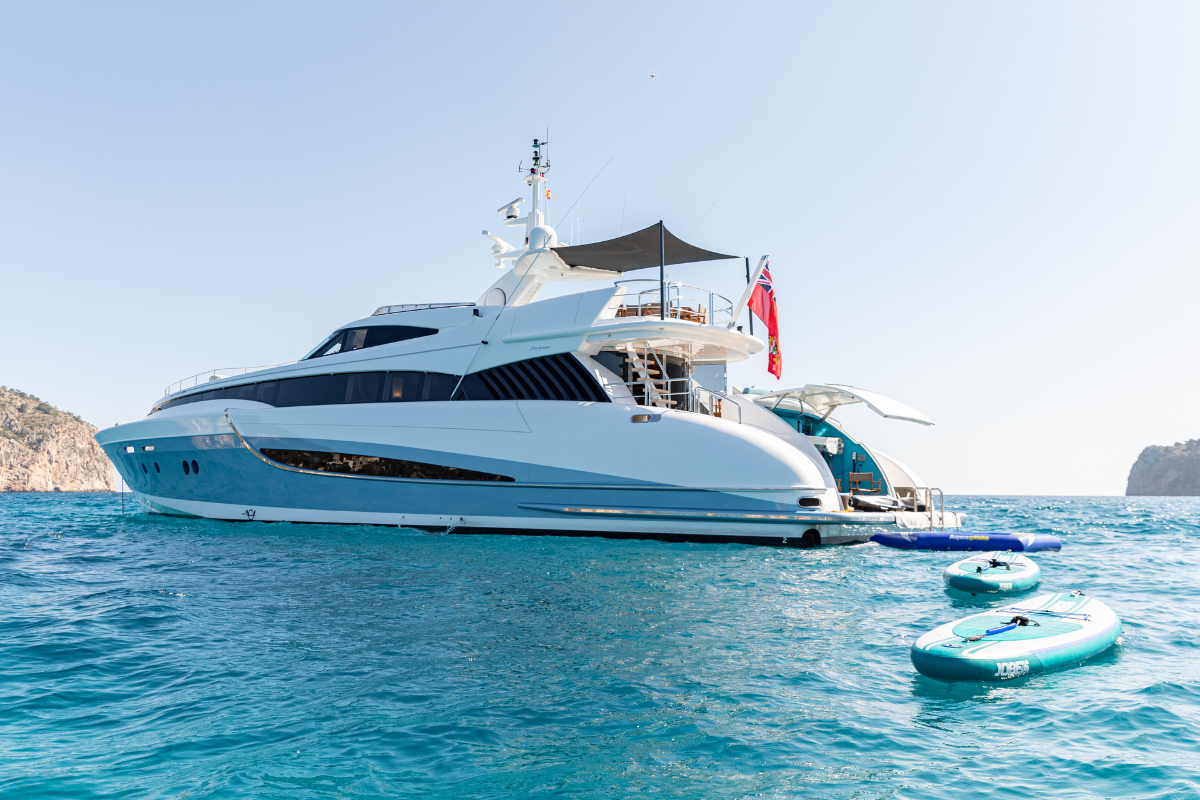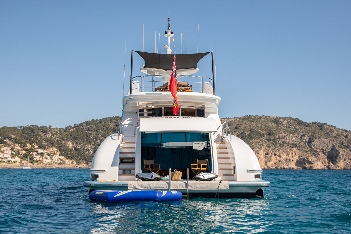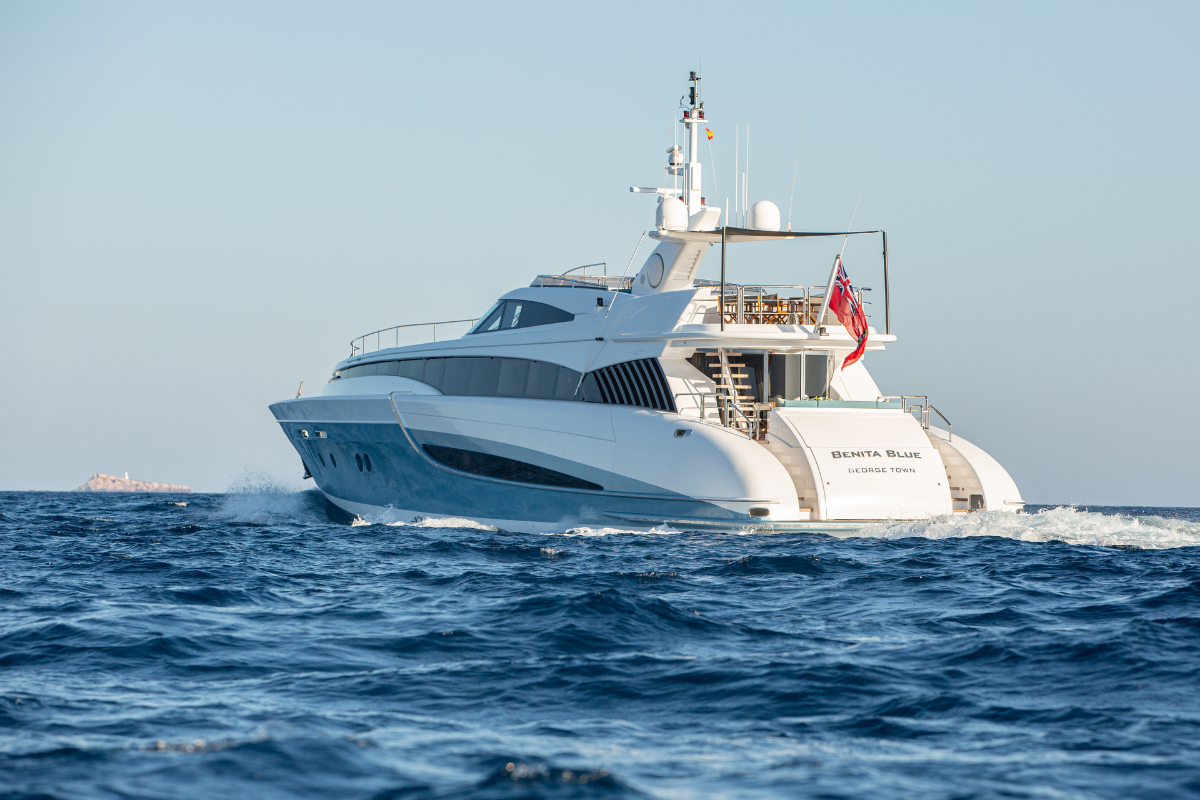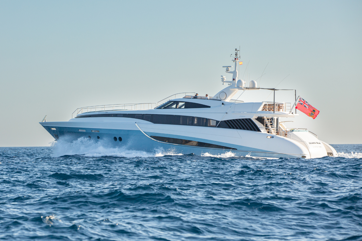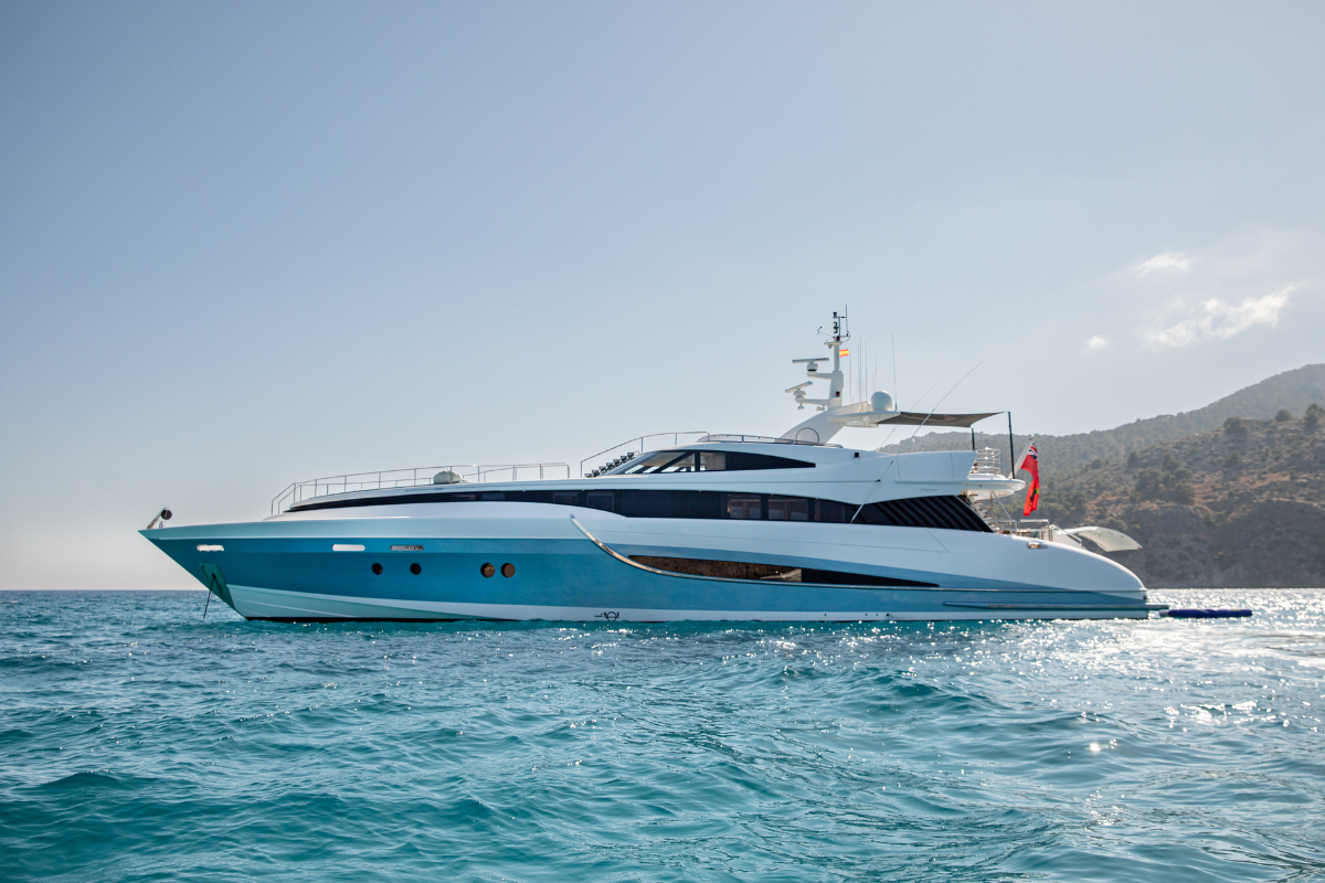 Benita Blue is a 33.7 m luxury flybridge yacht, accommodating up to 10 guests in 4 elegant cabins. Fully refitted in 2024, she features a master suite with en suite bathrooms, double/twin cabins with Pullman berths, a deck Jacuzzi, spacious outdoor areas, and modern AV systems with Wi-Fi. Perfect for private yacht charters in the Balearic Islands, guests can enjoy paddleboards, 2 Seabobs, wakeboards, waterskis, inflatables, and a 3.8 m turbojet tender. Powered by twin MTU engines, she cruises at 15 knots with a max speed of 24 knots. With a professional crew onboard, Benita Blue offers a perfect blend of luxury travel, adventure, and comfort for an unforgettable crewed cruise in the Balearics.