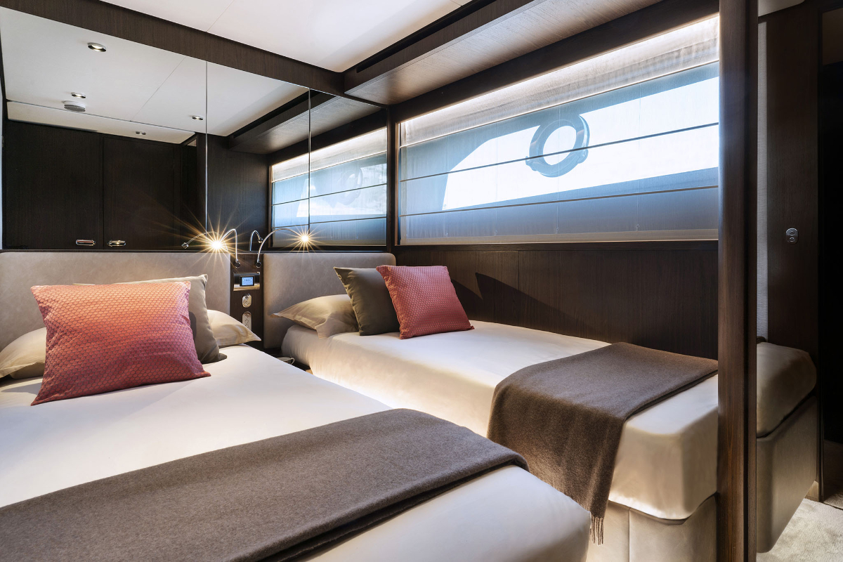 On the lower deck, four beautifully appointed cabins accommodate up to eight guests, including: 1 Owner’s suite, 1 VIP cabin, 1 Double cabin, 1 Twin cabin convertible into a double. All cabins are equipped with en-suite bathrooms for maximum comfort and privacy.