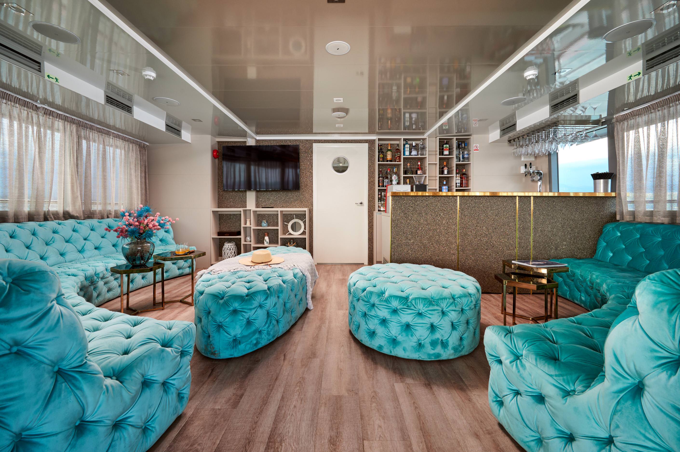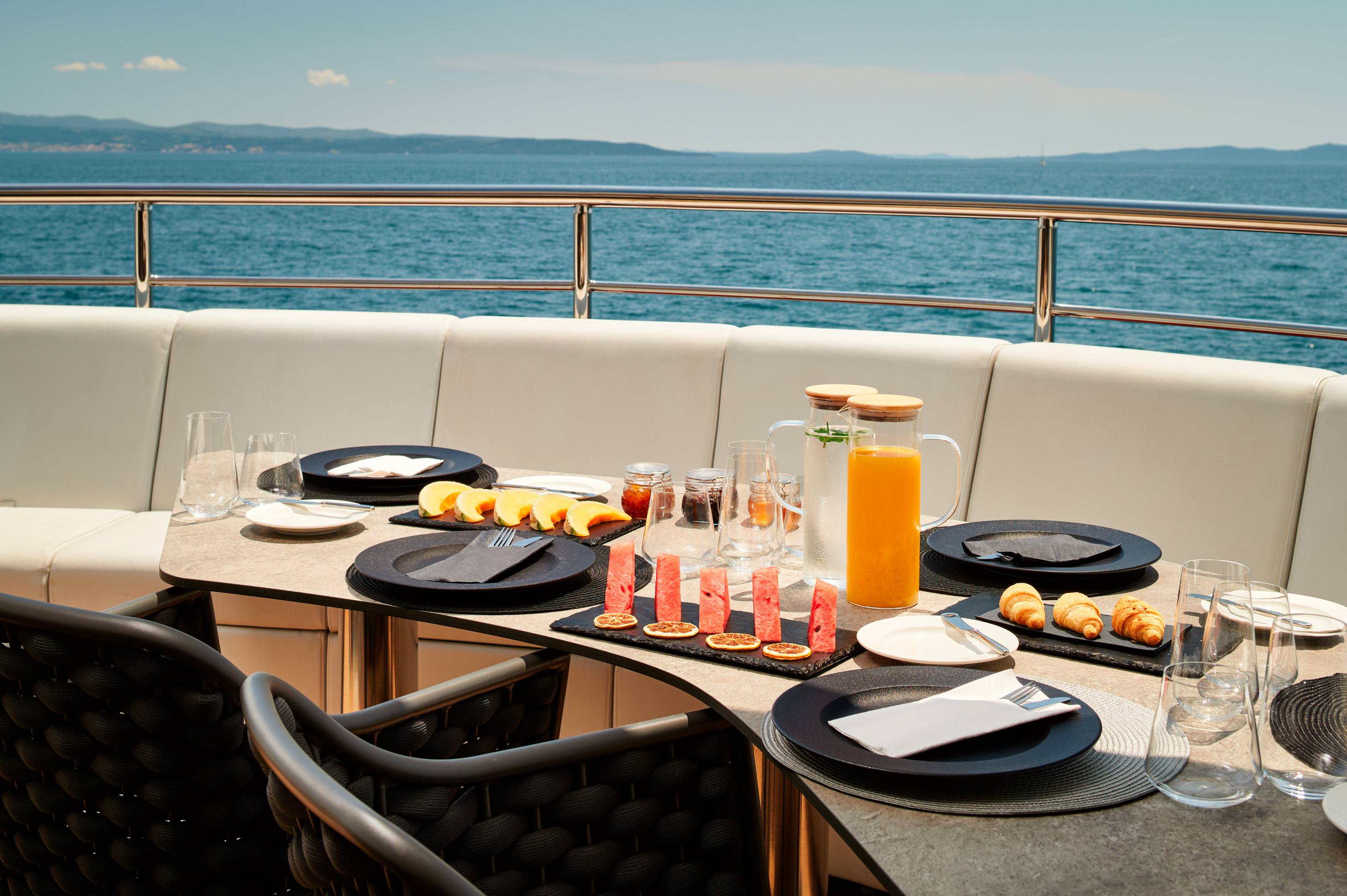 - Elevated Culinary Experience: Enjoy gourmet meals indoors at marble dining tables or alfresco on the upper deck lounge, with two bars and sunset views to complement every bite.