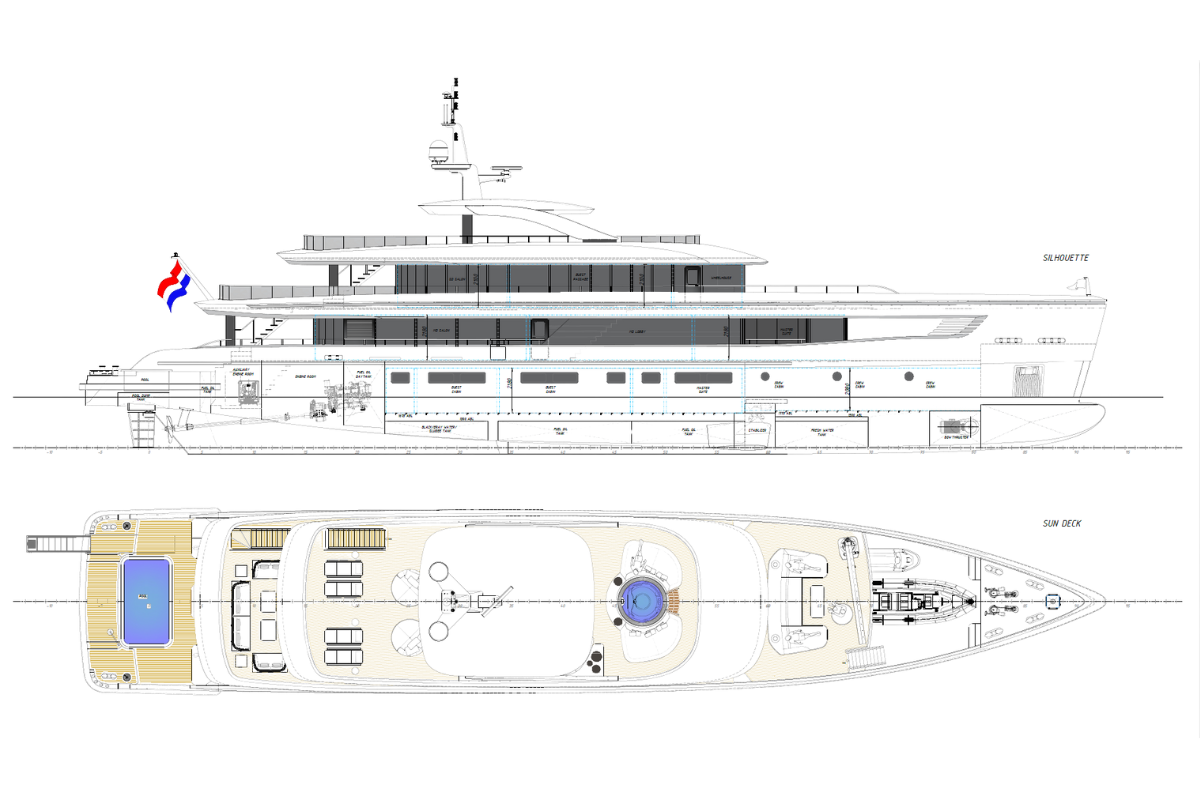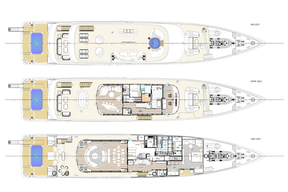 Guests will be captivated by the spacious main deck lounge, complete with a bar and comfortable seating that leads to a large swimming platform featuring a pool and beach club. The upper deck offers an outdoor lounge ideal for relaxation and dining, featuring a large round table for 12, sunbeds, and a lounge area. The sun deck is designed for ultimate leisure with sunbeds, a jacuzzi, BBQ facilities, and a sunbathing area on the bow. Axa will be equipped with an array of water sports equipment including jet skis, Zodiac, sea-bobs, e-foils, etc. ensuring endless fun on the water.