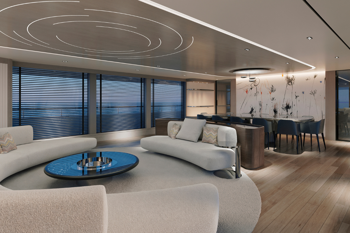 Inside, ORIY boasts a large main salon with round sofa for social gatherings and a large dinning table, an upper salon - skylounge with a bar, lounge area and TV, and accommodations that include one Master Suite with an office and balcony, one VIP Cabin with a walk-in wardrobe, and four Guest Cabins. Additional amenities such as a gym and sauna enhance the onboard experience.