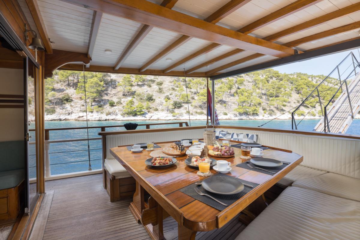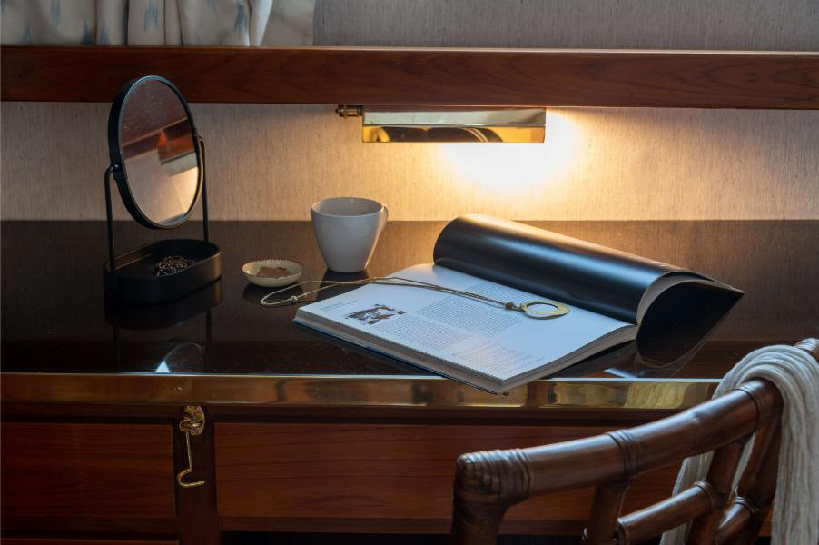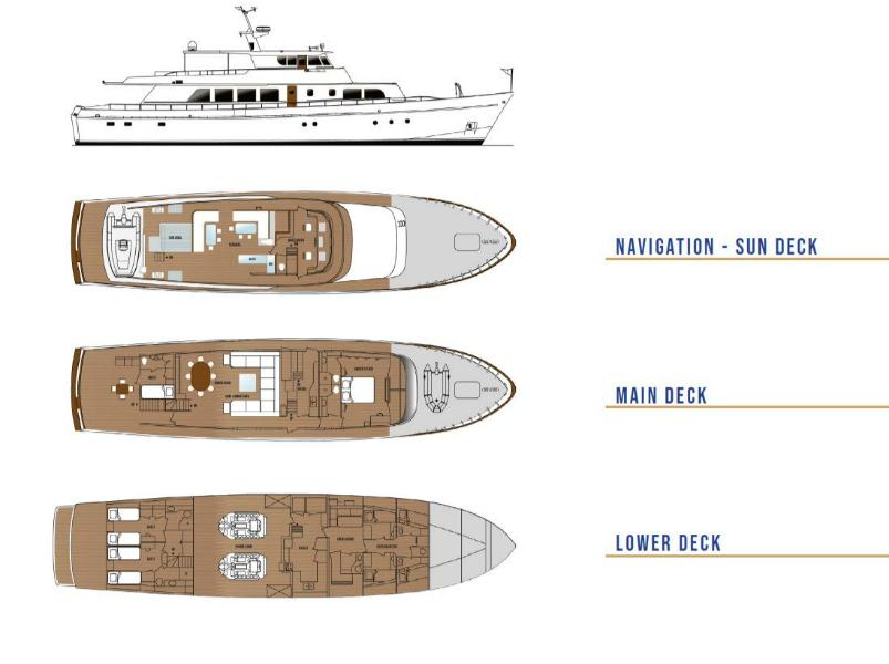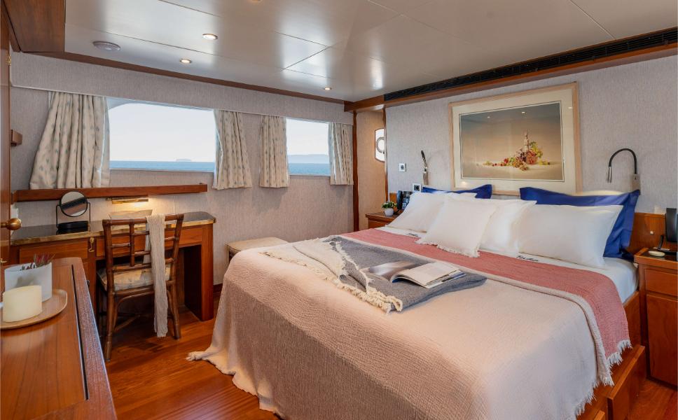 - Accommodation for 9 guests in 4 cabins, all with en-suite bathrooms: Main deck master suite, Main deck single cabin, 2 guest cabins on the lower deck