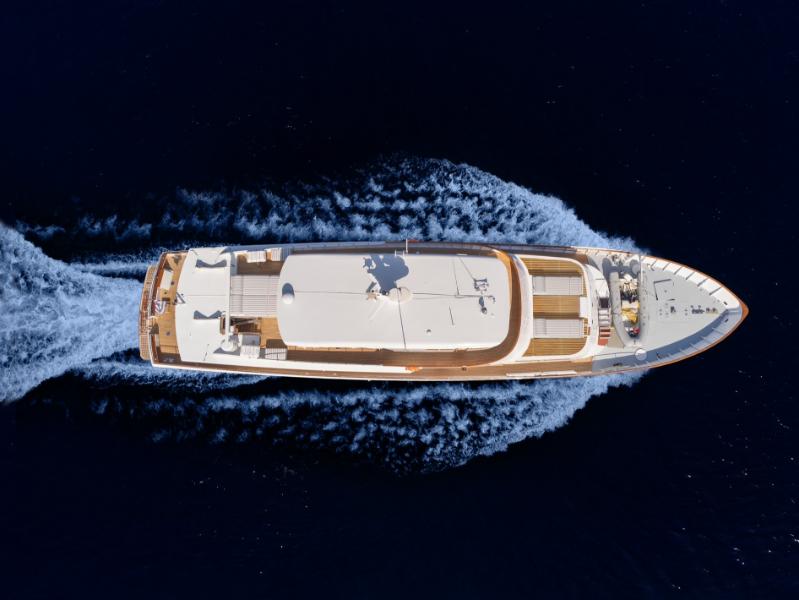 Her efficient hull design ensures remarkably low fuel consumption of just 290 liters per hour at a comfortable cruising speed of 14 knots. TAKA offers expansive deck areas and refined interiors, perfect for both relaxation and entertaining. She welcomes up to nine guests in four elegantly appointed cabins, each with en-suite bathrooms. Uniquely, she features both a main deck master suite and a main deck single cabin, complemented by two additional guest cabins on the lower deck.