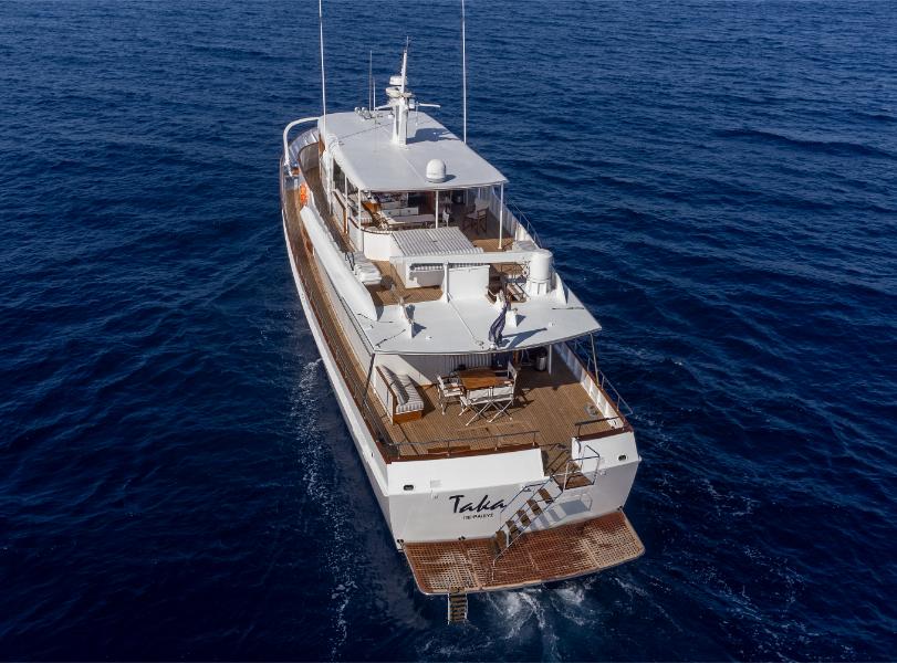 M/Y TAKA is a distinguished 30m gentleman’s yacht, proudly American-built by Sparkman & Stephens. Constructed entirely in aluminum with a semi-displacement hull, she was designed to deliver outstanding cruising performance, combining style, comfort, and safety. With both at-anchor and underway stabilizers, she guarantees smooth sailing in all conditions.
